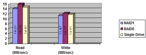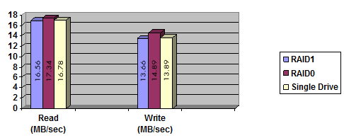 Withthe DNS-323 shares now accessible, I decided to run a few speed teststo see how efficient the device was. The first test I ran was copying a700MB file from my computer’s 36GB Raptor hard drive to the device, andthen back. I repeated this test for RAID0, RAID1, and individualconfiguration for the device to see how the speeds changed. These testswere carried out from both Linux and Windows, and the speed differencewas indistinguishable.