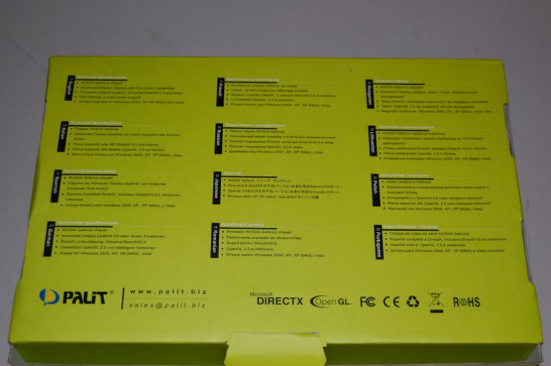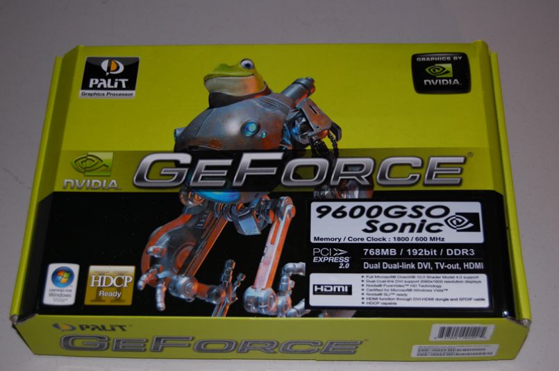 The Palit 9600 GSO Sonic shipped in a green box, stylized with Palit’s robotic frog avatar on the front of the package, as well as the logos for Palit, nVidia, and the GeForce series. Stamped on the front is also the information regarding the 9600 GSO Sonic, such as that I’m looking at the model with 768MB of RAM.