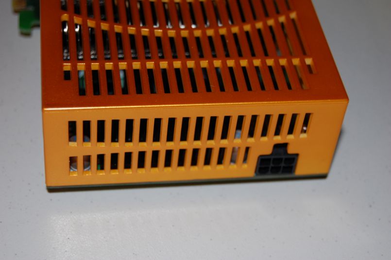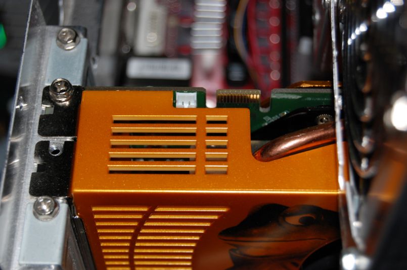 The side opposite the PCI-Express connection reveals some of the heatsink’s copper heatpipes. Not many videocards come standard with copper heatpipes and a massive heatsink. Also visible here are the unit’s SLI connection and a SPDIF connection for running audio through the HDMI.