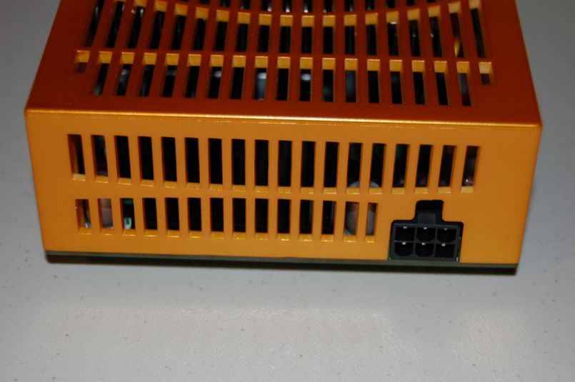 The opposite side reveals a single six-pin PCI-Express power connection. Only the high-end models of the GeForce 9×00 family require the eight-pin connection.