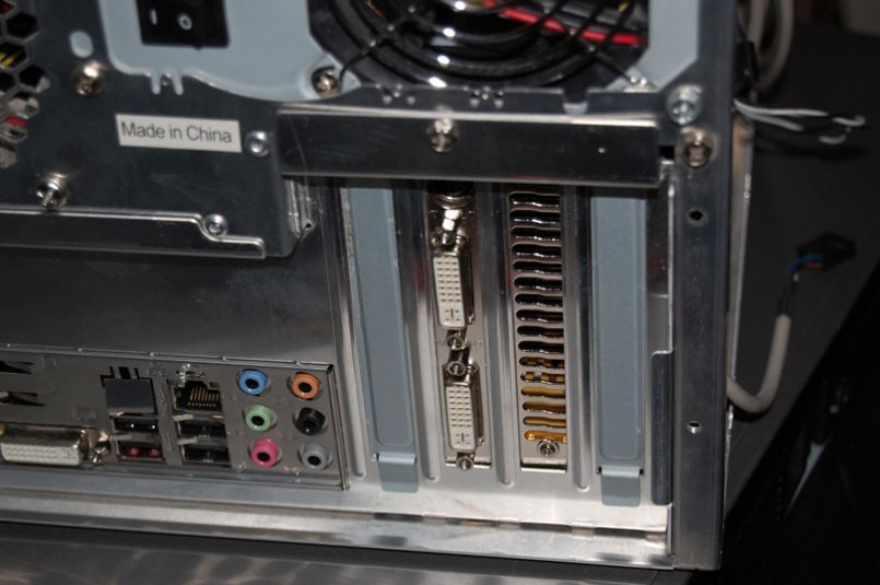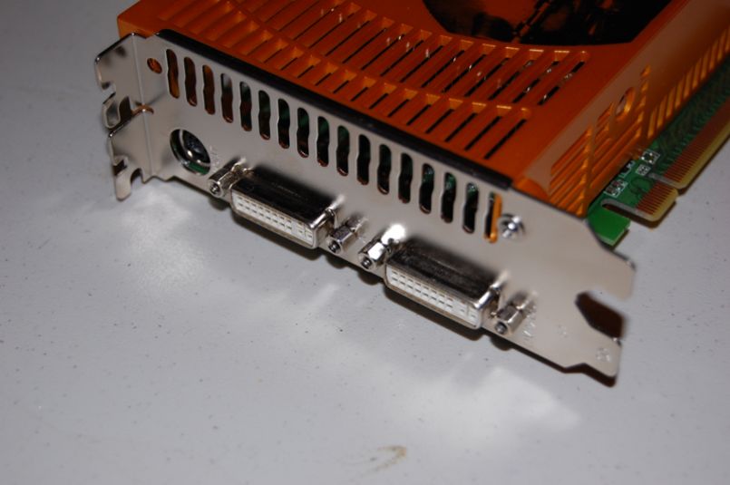 The rear of the card has two DVI ports and an S-Video out as well, like many other cards. I was disappointed not to find any HDMI or DisplayPort connections built into the card, but the HDMI dongle remedies this issue.