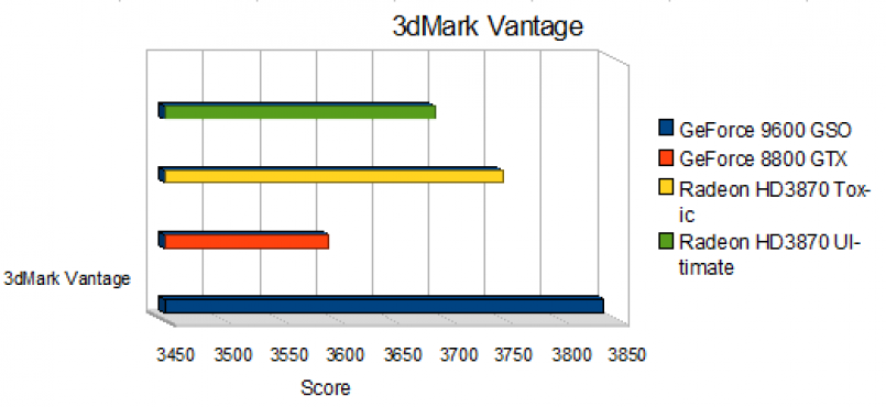 For all but one benchmark, the Palit GeForce 9600 GSO fell where I expected it to: behind the GeForce 8800GTX. The 9600 GSO does feature PCI-Express 2.0 support, which the 8800 GTX does not, but it is still clocked slower. It kept up in some of the newer benchmarks and games such as Unreal Tournament 3, but really surprised me when it blew past both the 8800 GTX and Radeon HD3870 in 3dMark Vantage score. My first guess was that it was the videocard offloading the physics of the game from the CPU to the GPU, but the 9600 series isn’t yet supported for PhysX in the nVidia drivers.