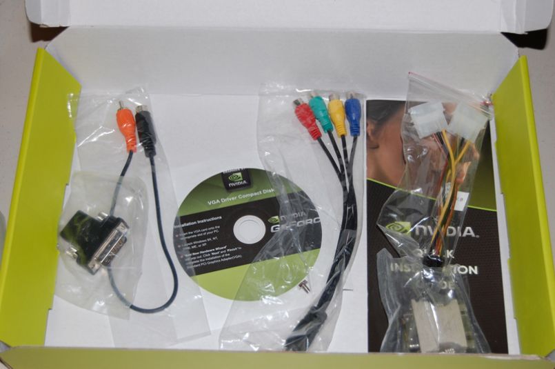 Under the card were various accessories: HDMI dongle, S-Video and component adapters, power connector, and a VGA dongle. Also included is a small brochure and driver CD.