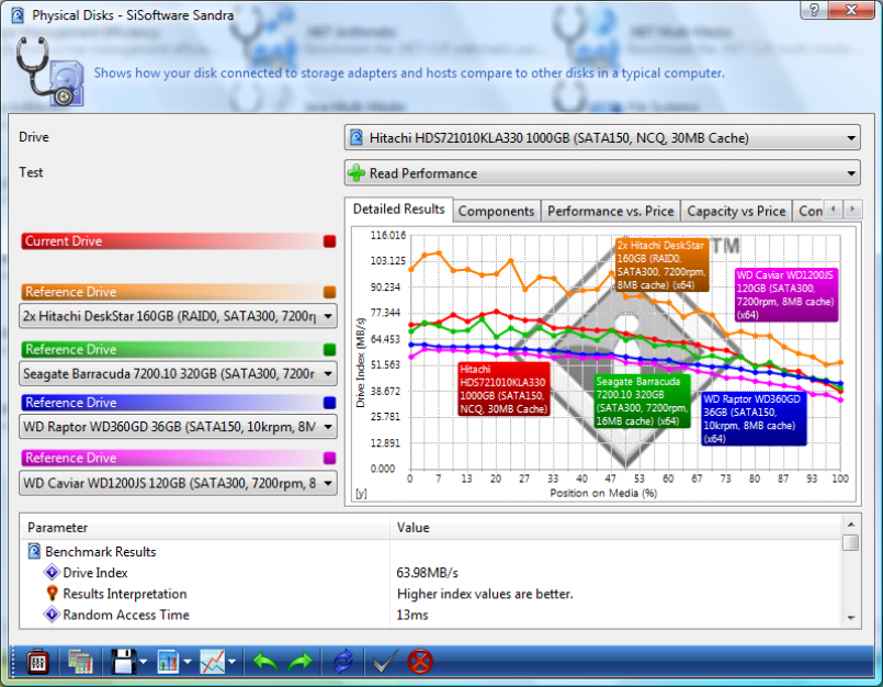 SiSoft provides two excellent hard disk benchmarks with the Sandra suite: Physical Disks, and Filesystems. I’m going to use the physical disk benchmark, which will benchmark read speed, write speed, and latency/access times.