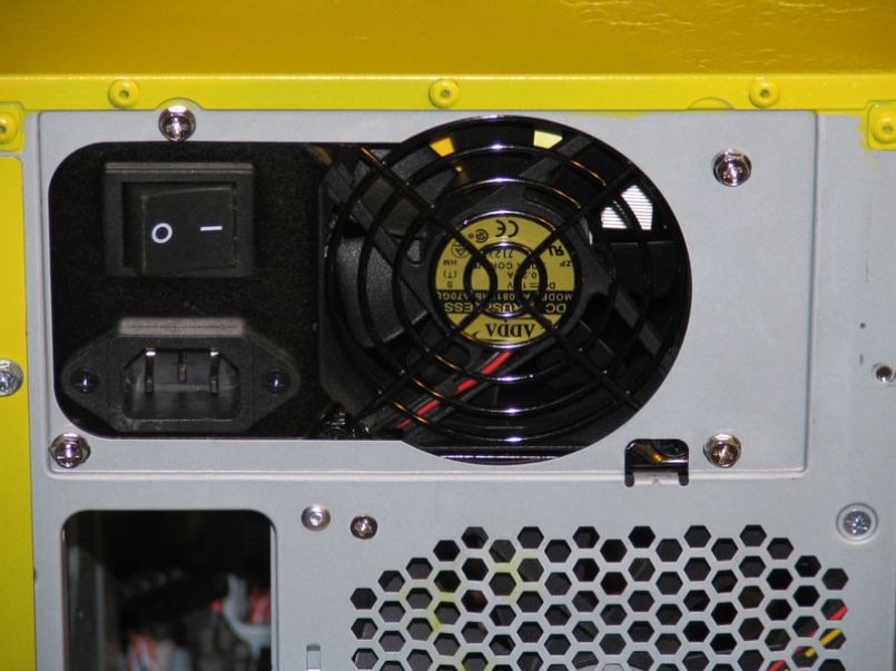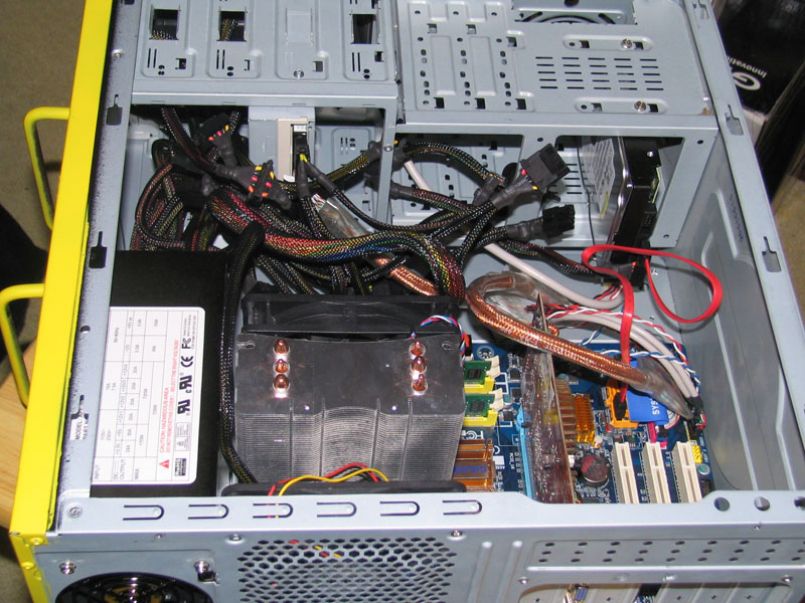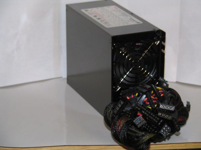 Just to be sure I got a good draw on the machine, I moved my 8800GTX video card, two additional hard drives, three Vantec Tornado case fans, and about eight cold cathodes to the vicinity of this case and hooked them all up. This brought the grand total of hardware to a Core2 Duo E6300, 2GB of Crucial Ballistix Tracer DDR2 RAM, a GeForce 8800GTX, five SATA2 hard drives, six cold cathodes, and 7 case fans.
