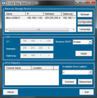 Using D-Link’s utility, I’m able to discover the DNS-323 on mynetwork. The utility also lists the available shares on the drive, andgives you the ability to map them to a driv