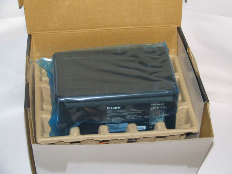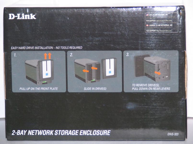 I was surprised at how large the box for the DNS-323 was as comparedto other storage enclosures. The front had a large picture of theenclosure itself, as well a quick list of all the immediate features Iwant to see from this device. The rear of the box, however, displayed aquick-install diagram, showing how to insert and remove drives from theenclosure. Looks pretty easy to me.