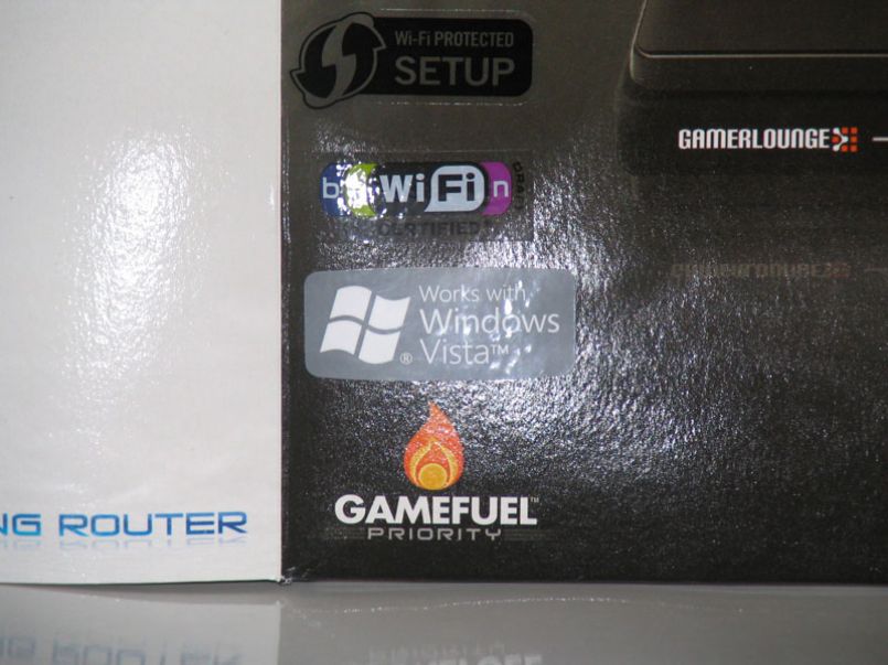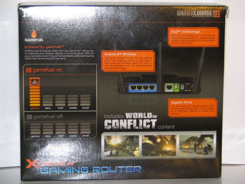 The rear of the box showed the rear of the router, introducing the concept of Xtreme N Wireless and the gigabit ports. There’s a short brief on D-Link’s Gamefuel technology, which graphs showing network performance when it’s enabled.