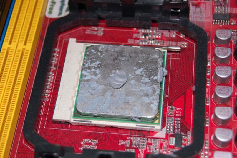 More compound stuck to the heatsink than anything else. This could be the result of a number of things: improper cleaning, poor surface, poor humidity conditions, etc. Thusly, I stuck with my favorite method.