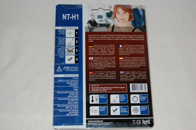 Like all of Noctua’s products, the NT-H1 comes in packaging bearing Noctua’s red and blue palette. The compound is held in place by a piece of plastic attached to the front of the packaging. A few features are listed on the front.