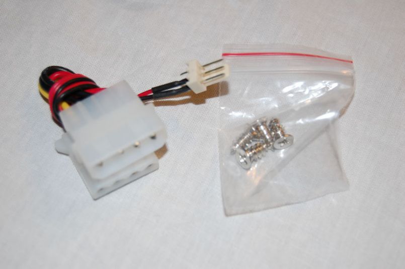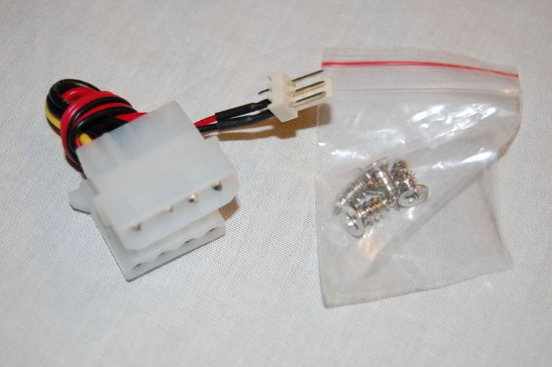 The packages had to be cut open, as they were sealed around the edges. Inside was the fan and an adapter for switching the power source between a 4-pin molex and 3-pin fan connection.