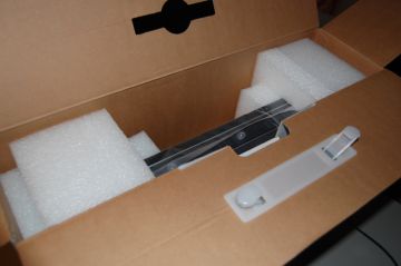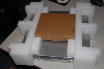 Inside, the TS-409U is protected by two pieces of Styrofoam, holding it securely in place. A cardboard box is also being held by the cardboard.