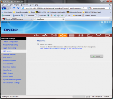 The unit’s transfer speeds far exceed that of 10/100 networking, so the unit is best used on a gigabit network, although not absolutely necessary. The unit’s NFS shares turned out to be reasonably faster than Samba, but that was expected due to the processor’s speed and architecture.