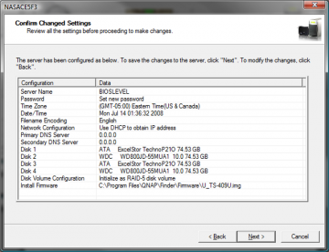 The configuration consists of a network configuration, naming, time zones, and the hard drive configuration. For my benchmarks, I decided to put all four of disks in RAID5, for a mixture of space, performance, and reliability. If one of my disks fail, I’ll be able to replace it and the TS-409U will rebuild my array with the three working drives and the new one.