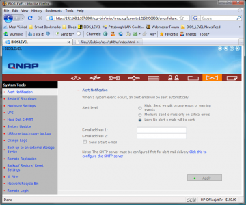Since quick configuration had been completed by the finder application, I started in System Settings. Here, I was able to change the server’s name, adjust the time, change the language, and view all settings. Additionally, I could have set up the unit’s mail alerts that sends e-mails when the server experiences an error.