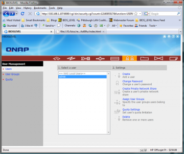Next, I moved on to the user tab. Here, I can add and remove users, set quotas, and creative group permissions.