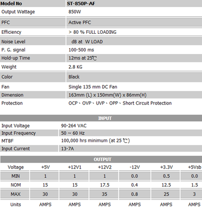 The ST-850P-AF is 80PLUS certified, meaning that it is 80% or more efficient in the conversion of AC power to DC power. For the review, I’d like to look at the unit’s performance in a workstation setting. With a workstation, I believe it’s customary for the machine to draw large amounts of power regardless of how efficient a power supply may be. Of course, the other reason I could be neglecting this section is because of my trusty Kill-a-Watt fried during a storm and no longer measures amperage for me!