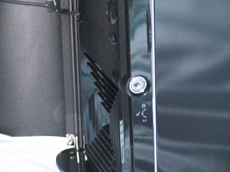Once I had the case unwrapped, the first thing that struck me was the finish on the sides of the case. It’s a definitely a piano mirror finish. I could see my reflection just fine in the black paint. The door is curved much like that of the Tsunami Dream, and feels about the same; it’s got some weight to it, but not much, for it’s made from aluminum. The rear is like any other computer.