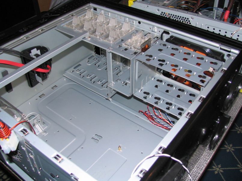 One you get the monster thumbscrews off and take off the side panel, you’re greeted by the usual site of an empty case. But this isn’t just any interior, there’s a few special features included to put the case above the competition. You’ve got tool-less slides that lock 5.25″ and Floppy Drives in place, saving you from having to find the right-sized screws and all that bothersome business.