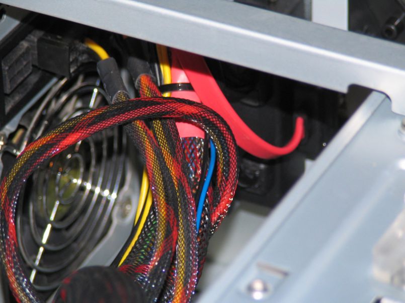 Upon turning it on, I was happy to find that the rear fan had blue LED’s in it. Lights are always a plus when there’s a side window. Similarly, the door on the front has blue lights behind the handle and throws off a nice glow on the front. I was fairly pleased for the lights and general quietness of the case while running.Measuring the interal temperatures, the hard drive were running at ~38°C, while the CPU was idling at 40#176;C and case temperature hovered between 35#176;C and 38#176;C. Not too bad. I think the 140mm fan in the front really does help, but cables hiding in the hard drive bays didn’t help airflow, either.