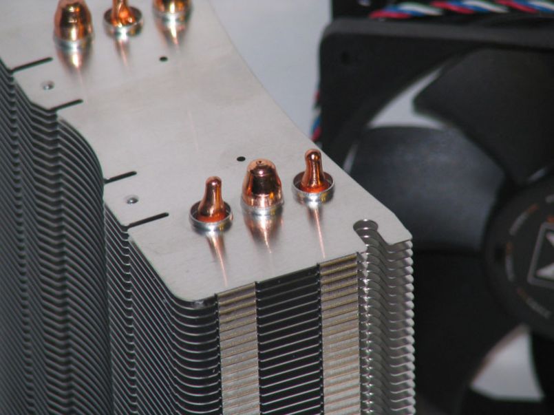 As the heatpipes extend upwards, multiple layers of “fins” are attached. The heatpipes transfer the heat into the much thinner finds, and then the air blown by the fan takes the heat from the fins.