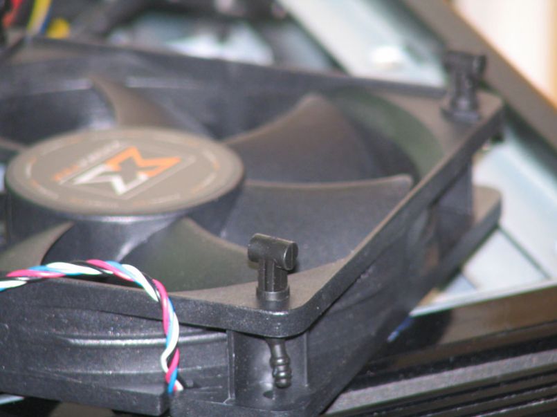 The last step is to mount the fan to the heatsink. This should be done last, because you most likely won’t be able to get to the push-pin screws while the fan is mounted. To mount the fan, Xigmatek supplies four rubber pieces that stick in the fan holes, then slide ito the heatsink’s fins. The rubber prevents vibrations against the heatsink, reducing the sound the fan makes.