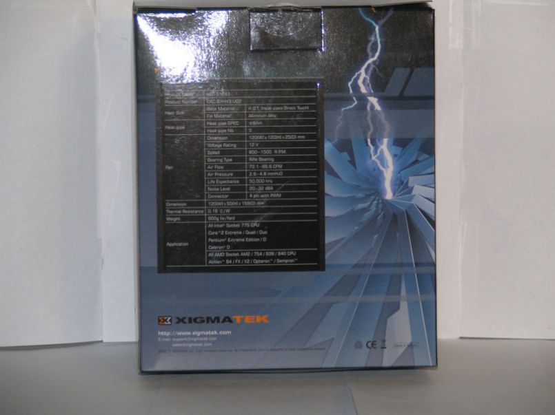The front of the box has a window that displays part of the 120mm Fan, as well as the Xigmatek sticker on middle of the fan. Below the window is the primary feature of the heatsink, the “Heat-pipe Direct Touch” technology, as well as a short feature list.